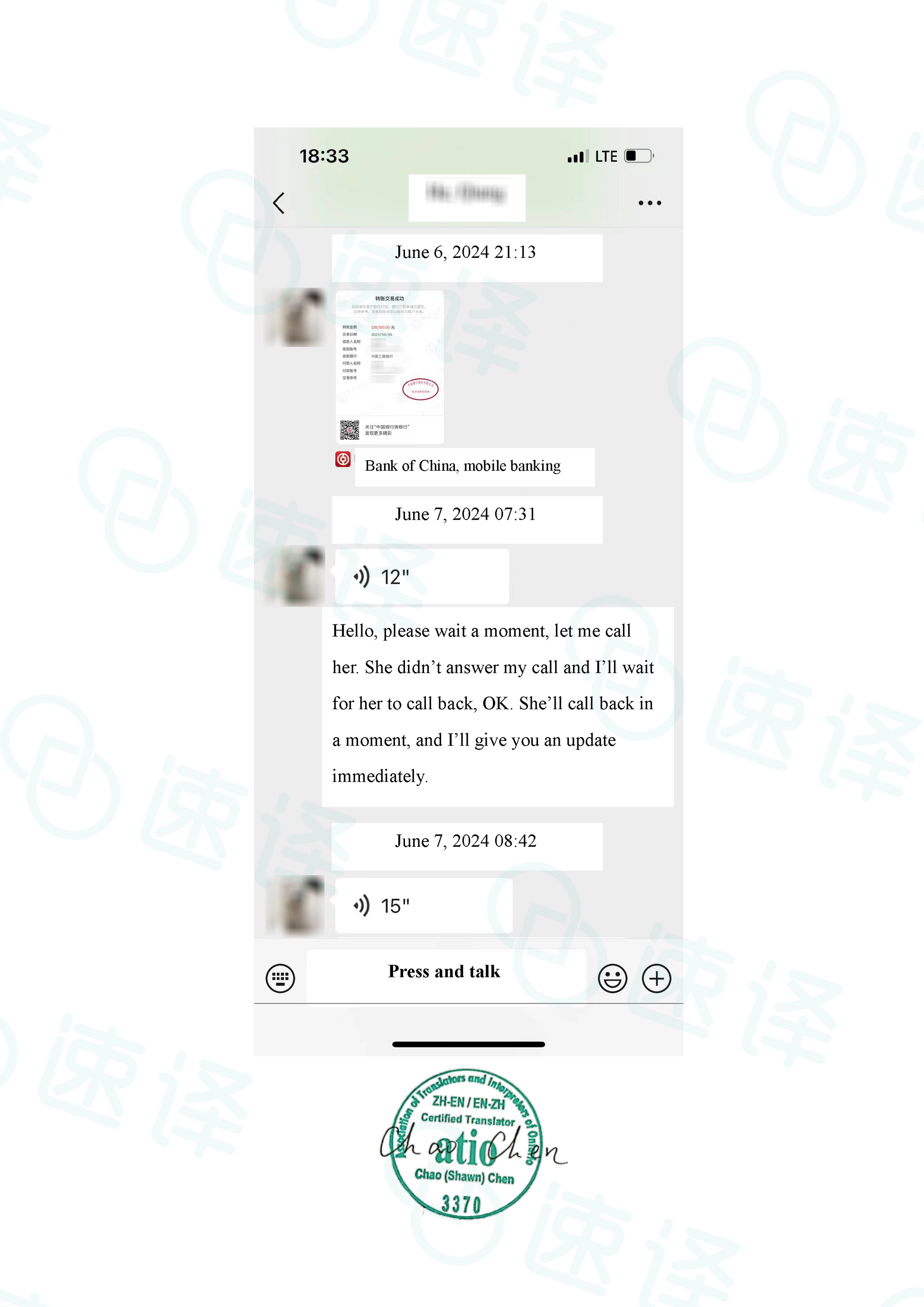 速译为您提供专业的加拿大安省ATIO(安大略省翻译协会)认证聊天记录翻译服务。我们了解聊天记录在法律诉讼、移民申请、家庭法案件等场景中的重要性,因此为您提供符合官方要求的翻译文件,附带翻译盖章声明,可直接递交至加拿大法院、移民局(IRCC)及相关机构。